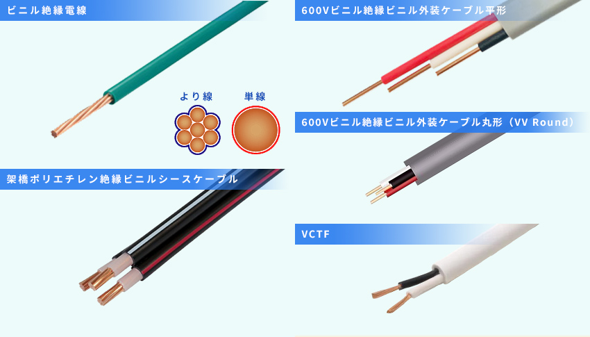 1本の電線に絶縁被覆がしてあるもので単線と撚り線(よりせん)があります。